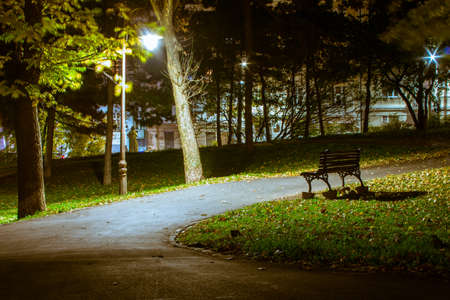 The bench in the autumn park in Belgrade at night. Serbia