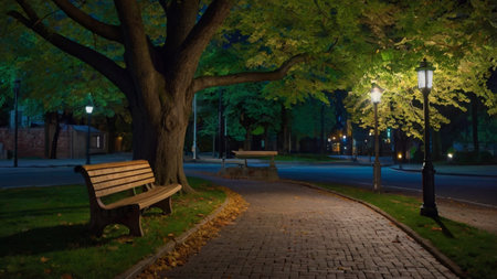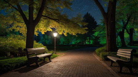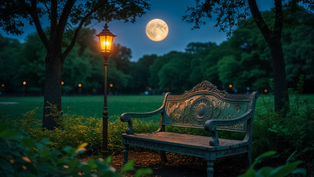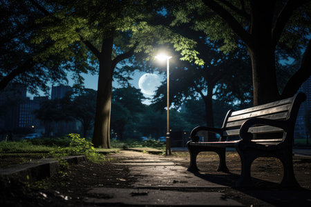 Serene night in urban park under soft moonlight., generative AI