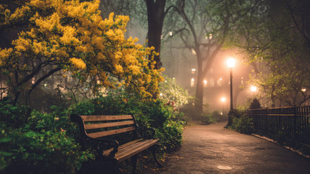 A lonely bench sits in a park surrounded by dense fog and illuminated by soft lights creating an eerie and tranquil atmosphere late at night.