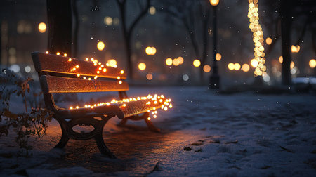 A serene winter scene featuring a bench adorned with glowing string lights amidst gently falling snow, creating a warm, inviting atmosphere perfect for cozy evenings.