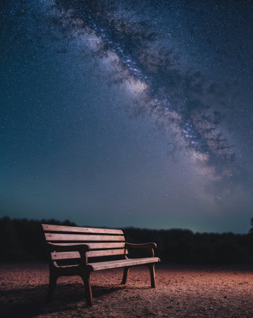 AI Generated. Nighttime Landscape with a Bench Under a Starry Sky