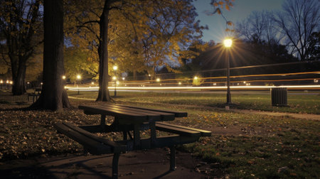 The park benches and picnic tables aglow with soft light from the passing car trails