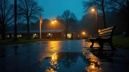 A hauntingly beautiful night scene: rain-soaked schoolyard illuminated by streetlamps, empty bench askew. Perfect for thriller, drama, or poetic isolation themes.