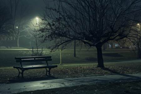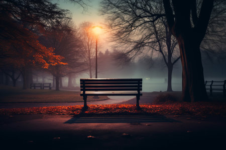 A lonely bench in a foggy park, evoking a sense of isolation and sadness