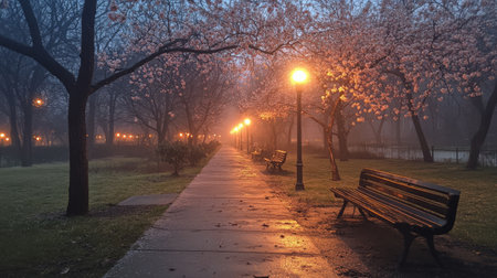 A quiet park features benches alongside a paved walkway lined with cherry blossom trees in full bloom. Street lamps cast a warm glow through the morning mist.