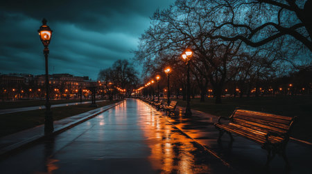 A serene nighttime park scene features glowing street lamps illuminating a wet pathway. Raindrops reflect the warm lights, creating a tranquil ambiance.