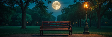 beautiful vintage bench in summer park at night, moon, lantern