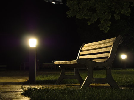 Wooden bench with flashlight in dark park