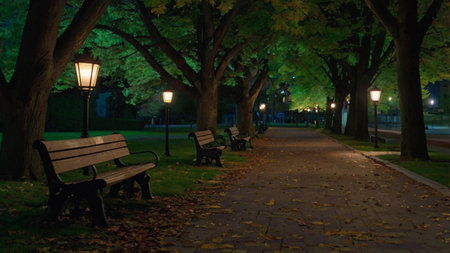 Benches line a pathway in a tranquil park illuminated by warm street lights at dusk.