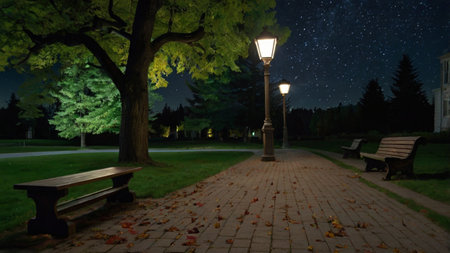 Lanterns and benches in the park at night with a starry sky