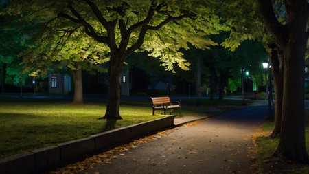 A serene nighttime image of a quiet park with path lights and peaceful surroundings, providing a contrast to the city's nightlife