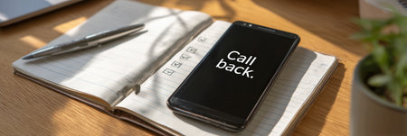 Smartphone displays reminder to call back, resting on a notebook with a pen in a warm workspace filled with natural light