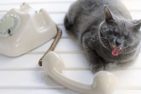 Seven year old girl talking on the old vintage phone and her sister eavesdropping her conversation. White background.