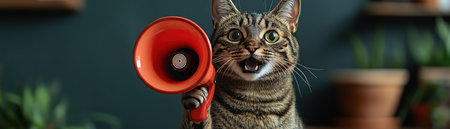 Cat shouting through a megaphone on a blue background with copy space. generative ai