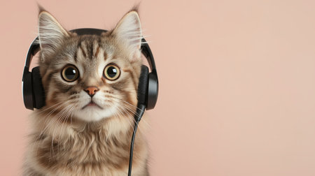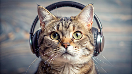 A tabby cat with green eyes wears headphones while listening to music. The cat has a serious expression on its face and is looking directly at the camera.
