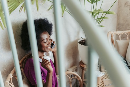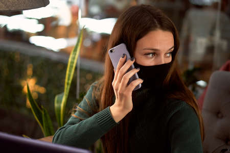 Portraits of a charming red-haired girl with a pretty face. The girl talks cutely with someone on the phone. She has a great mood and a sweet smile