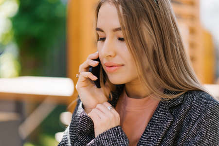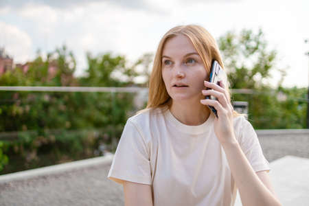 Emotional beautiful blonde talking on the phone outdoors. Female Corrupt faces and indulges in chatting with friends on the cell.