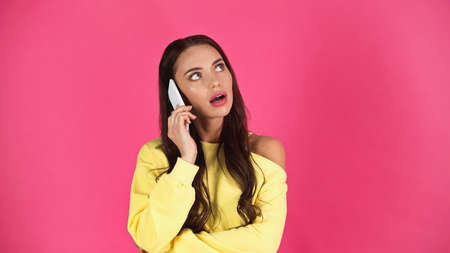 thoughtful young adult woman with open mouth speaking on cellphone isolated on pink