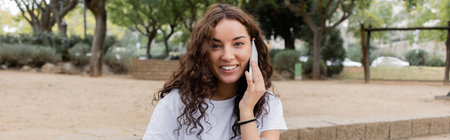 Portrait of young and curly woman in white t-shirt smiling at camera while talking on smartphone and spending time in blurred park at daytime in Barcelona, Spain, banner