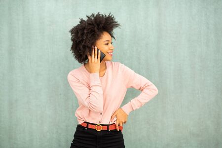 Young blond-haired girl wearing yellow t-shirt, talking with her smart phone leaning against a stone wall. Technology, music, lifestyle and relaxation concept.