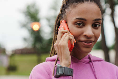 Close-up portrait of young beautiful sport woman using mobile phone outdoors