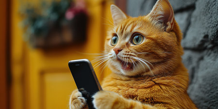 A fluffy pet cat looks into a smartphone and is surprised by the discounts. The concept of autumn discounts, black Friday sales.
