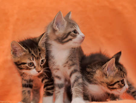 Homeless animals. abandoned kittens, cute kittens are playing, looking at the camera. Animal welfare in a homeless shelter. Low key, toned photo.