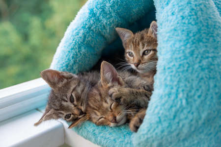 Three shorthaired tabby kittens sleep in a blue soft house.