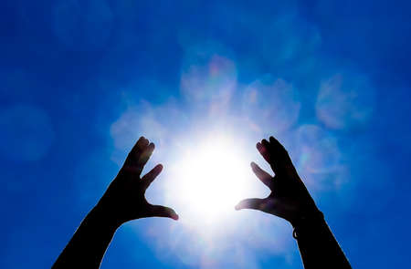Silhouette of hands against sun and blue sky background. Hands are raised up to the sun.