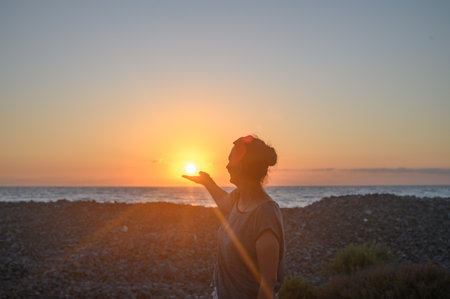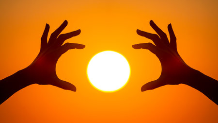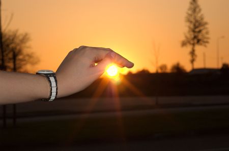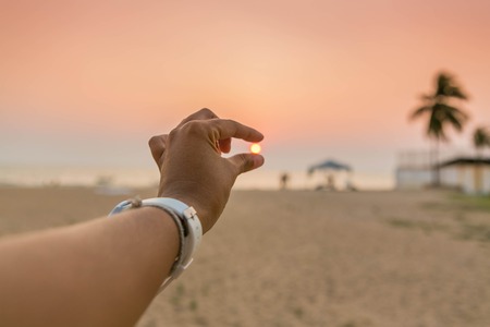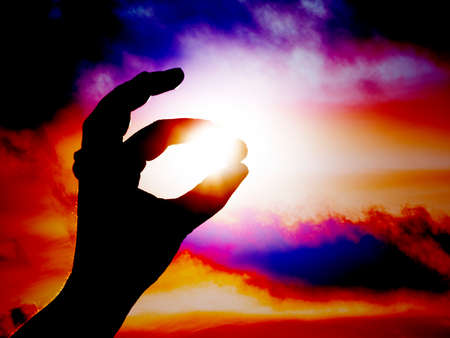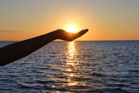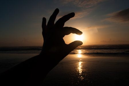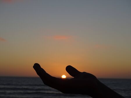 Hand catching the sun during the sunset, detail of the hand and the sun in the coast of the Pacific Ocean