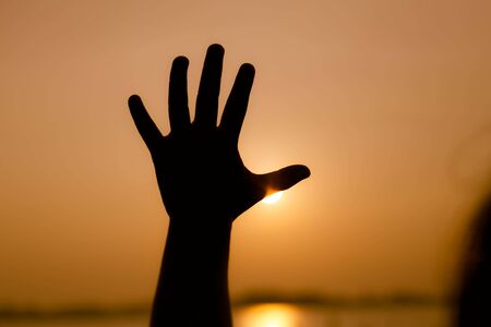 Silhouette of hand on the beach at sunset. Conceptual image.
