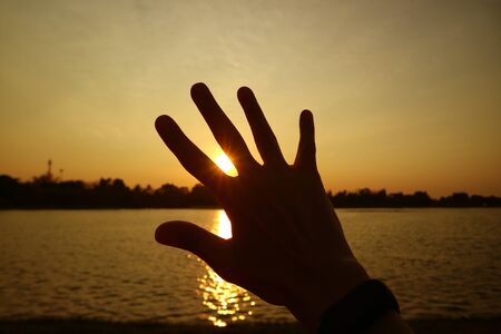 Hands catch sun at sunset time. Female fingers hold sun above lake level.