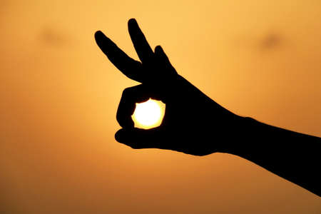 Male hand showing okay at sunset. Hand gesture Ok with sun in the background.