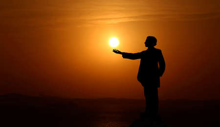 A young boy in a pool enjoying the sunset. Human silhouette over the setting sun. Holding sun in hand. Seascape. Copy space banner. Beautiful sky background. Balance.