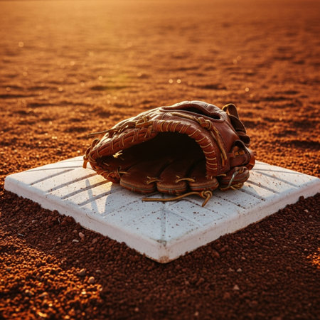 A worn baseball rests inside a vintage leather glove on a red dirt field, symbolizing the heart of the sport. A nostalgic image perfect for themes of tradition and sportsmanship.