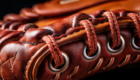 A close up view highlights the artistry of a handcrafted leather glove designed for athletic play.