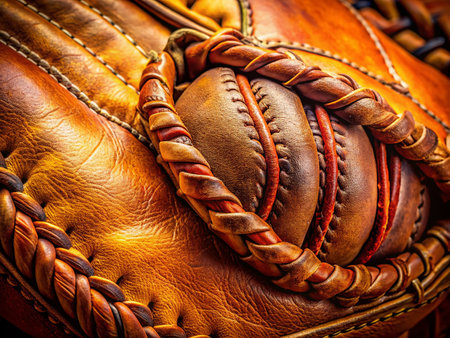 Close up view of a weathered baseball glove showcasing its durability and intricate stitching.