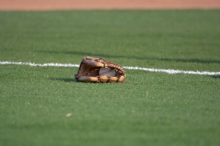 Baseball, sport and ball with glove on a grass pitch or field outdoor for a competitive game or match. Fitness, sports gear and skill with equipment on the ground for training, practice and game