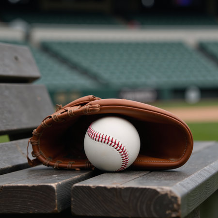 Baseball glove ball resting on a bench amidst blurry stadium seats