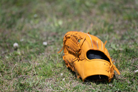 Durable Baseball glove with playing ball. Baseball pitcher game equipment on green grass. Generate ai