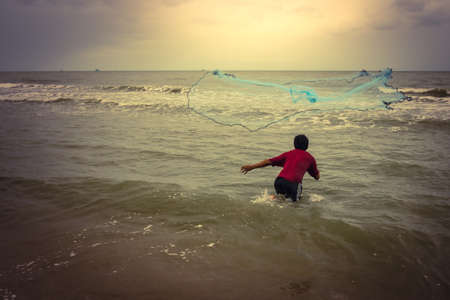 Traditional fishing net being thrown into a sparkling sea during sunset, highlighting maritime culture, livelihood, and ocean beauty.