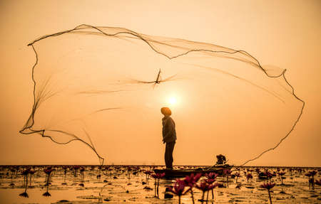 A fisherman casting a net into the water during on sunsrise. Silhouette.
