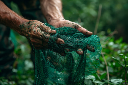 Hands male rope net people. Active mesh labor snare daytime. Generate Ai