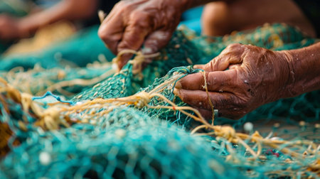 Skilled fisherman repairing intricate fishing net outdoors with dedication and expertise