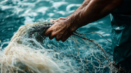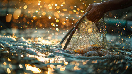 Hands of a fisherman handling a net at sunset on a fishing boat, with the golden light reflecting off the water