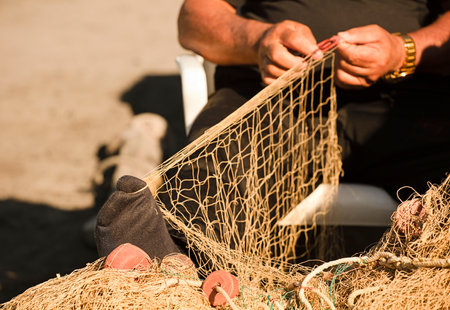 Close up of fisherman's hands repairing a fishing net at sunset, with a fishing boat in the background. Concept of traditional fishing and maritime work.
