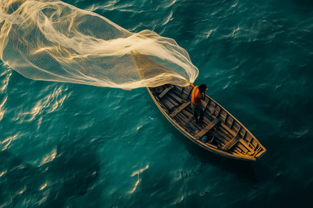 Fisherman is casting a net from his boat into the calm waters at sunset. Generative AI