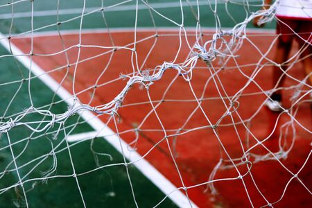A tranquil tropical sea at dusk looking through traditional fishing net, rural scene in Southeast Asia. Selective focus.