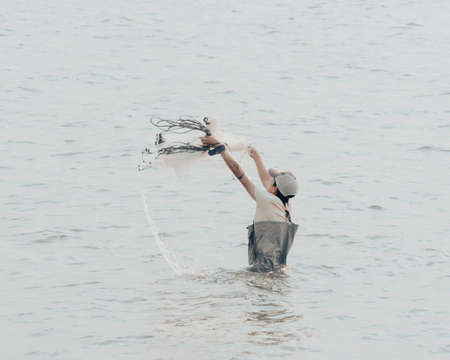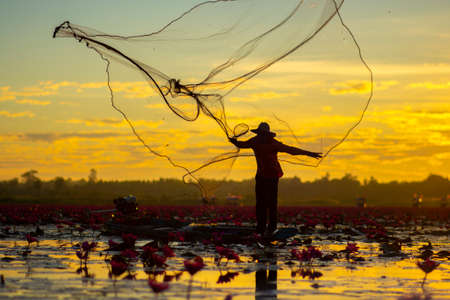Fisherman of Huitong Lake in action when fishing, Thailand