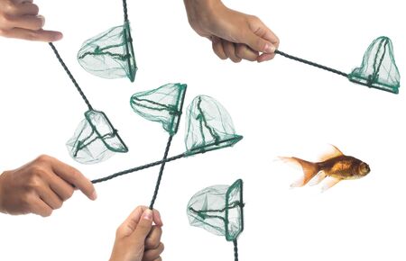 Sad man wearing excellent suit cannot extricate himself from his own net Concept of comparison fishing and business Isolated on white background